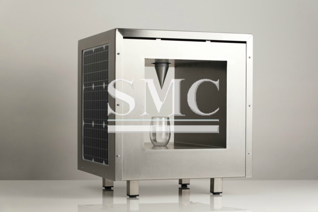 The water Cube is a 20-inch cube of stainless steel with solar cells embedded within that power a refrigeration device. The device cools an inverted cone to create condensation, which then dribbled into a glass to provide water. Pictures on the Sun Glacier website show how the technology operates.