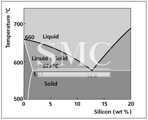 point at this composition is 577°C. At lower Si levels the solidus or the point at which melting begins is also 577°C. However, melting occurs in a range and the temperature above which the filler is completely