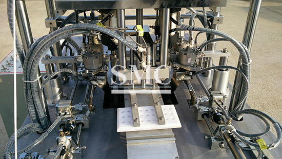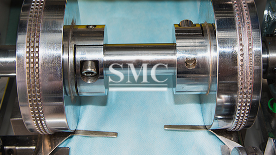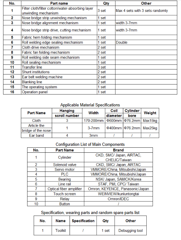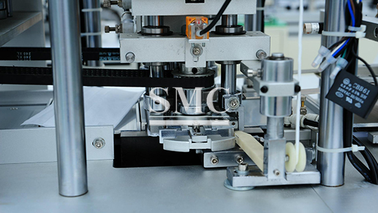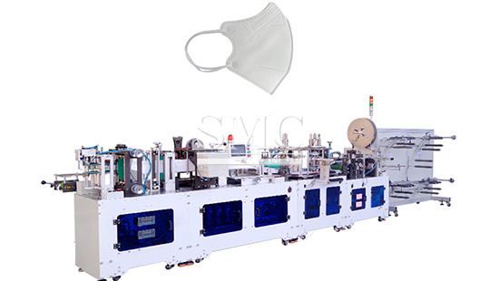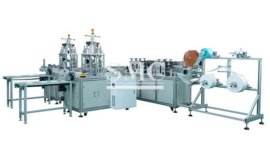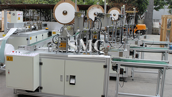 SMC face mask making machine: This device is connected by the host and two ear band welding machines. When the host makes a mask, it will be sent by the transmission belt to the ear band welding machine to weld the ear band part. Only one operator can manage the entire production. The production line can realize the fully automated production of flat masks.