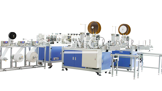 Face mask production mainly includes coil material feeding, folding and pressing, nose bridge tending material feeding, mask forming, mask cutting, ear band feeding and welding, and finished product blanking. It completes the entire production process from raw materials to mask finished products.